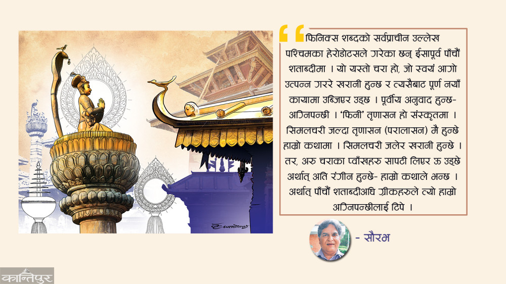 ‘फिनी’ तृणासन हो संस्कृतमा । सिमलचरी जल्दा तृणासन (परालासन) मै हुन्छे हाम्रो कथामा । घाँसबोधक पुलाबाट पराल भएको हो नेपालीमा । यसैले तृण र पराल भन्नु एउटै हो । विज्ञानले पनि धानलाई घाँस अर्थात् ग्रामिनेई परिवारमा राखेको छ । सिमलचरी जलेर खरानी हुन्छे– हाम्रो कथाले भन्छ । र, कशको अर्थ खरानी पनि हो । तर, अरू चराका प्वाँखहरू सापटी लिएर ऊ उड्छे अर्थात् अति रंगीन हुन्छे– हाम्रो कथाले भन्छ । अर्थात् पाँचौं शताब्दीअघि ग्रीकहरूले त्यो हाम्रो अग्निपन्छीलाई टिपे ।